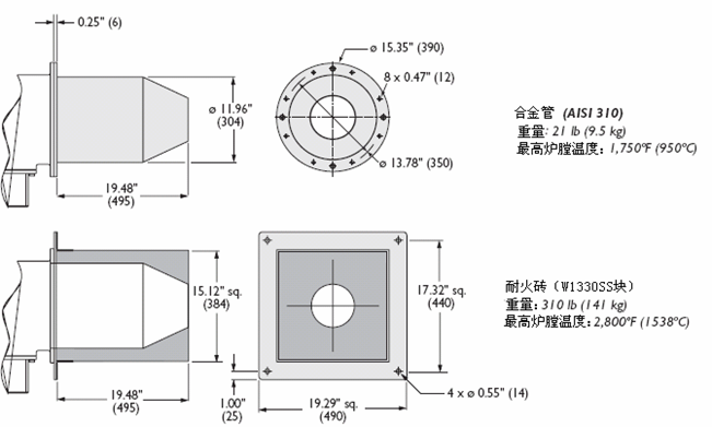 高火时火焰长度 in (mm)