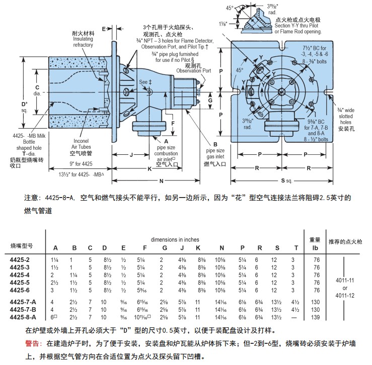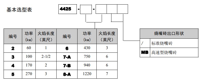 4425系列烧嘴是专为高温窑炉设计的高温烧嘴,是通用型4422系列烧嘴的高温型,广泛的应用于各种工业场合。4425烧嘴尤为适用于那些既在高温又在低温情况下操作的窑炉,例如批次处理炉,在初始阶段要求温度低于650℃和大量氧气,以保证原材料的加工品质;但是随着加工的深入温度会经常升到1093℃以上。由于其自身抗辐射的结构和灵活的过量空气调节,4425系列